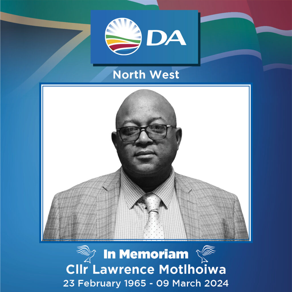 On behalf of the DA in North West, we extend our heartfelt condolences to the Motlhoiwa family, his friends and colleagues in the JB Marks Council. His noble character and passion for what is right will be greatly missed, but his legacy inspires us to live and work by the example he set.