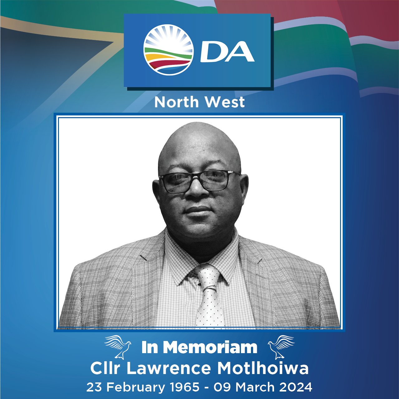 The DA in North West mourns the death of DA JB Marks Councillor, Lawrence Motlhoiwa, who sadly passed away on Saturday morning. See image here.